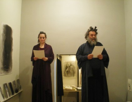 Hace algún tiempo el taller de La griega también se transfiguró. Dejó de ser un estudio de artista para convertirse en un escenario en el que los personajes de sus dibujos tomaron extraña vida a través de muñecos y objetos fabricados y manipulados por ella. A medida que el espectáculo iba sucediendo, al igual que en sus dibujos, la narración desaparecía y la palabra se hacía insuficiente para materializar esa alianza entre el nacimiento, el presente y el futuro que pretende la obra.