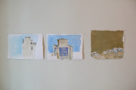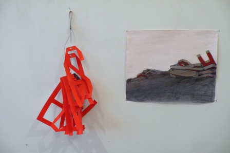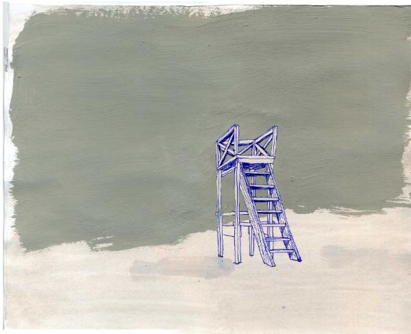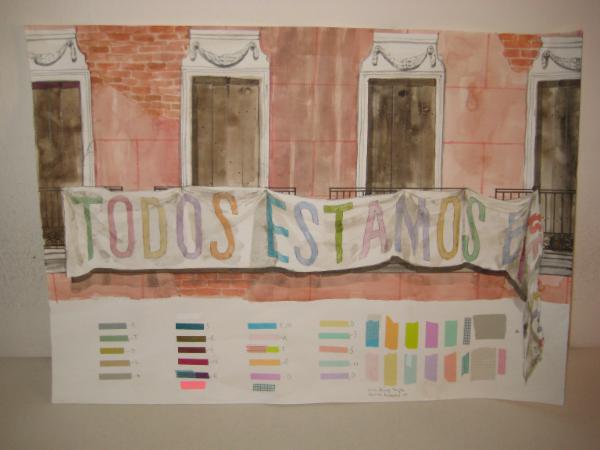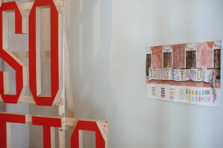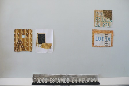 Esta instalación y el conjunto de dibujos que la acompañan también cuentan una historia, pero tratando siempre de rodear esa pantalla de representación y mostrar lo que hay detrás, narrar desde el punto ciego de la mirada. Muestran las cosas que se quedaron fuera de cuadro. Los dibujos explican el proceso de construcción de la imagen, parecen ser bocetos de una instalación pero rápidamente se delatan ellos mismos como pura escenografía que representa esa misma construcción: no sabemos si esos carteles están siendo montados o desmontados, si la consigna “todos estamos en peligro” está por ser lanzada o si ya ha sido consumida y está obsoleta.