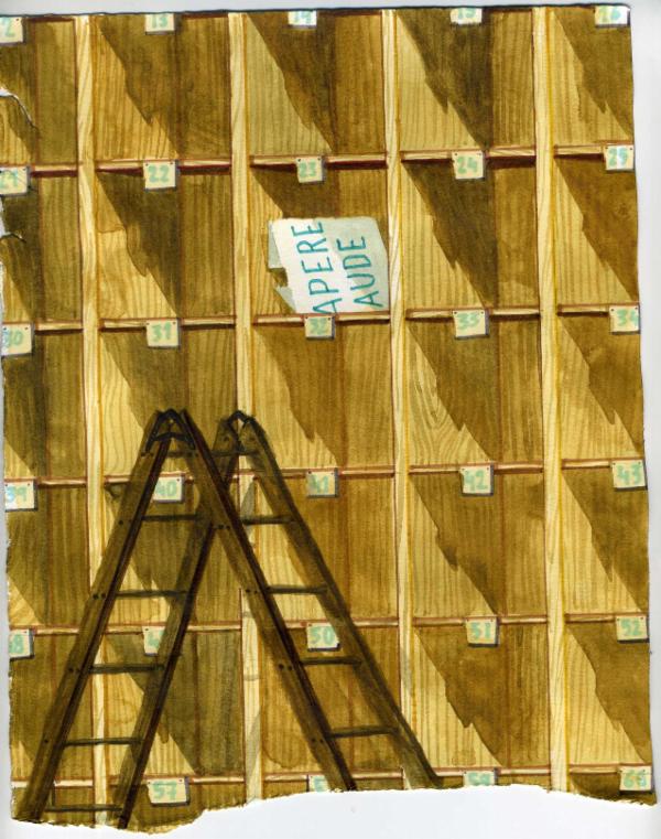 También encontramos en los dibujos la máxima latina Sapere Aude acuñada por Horacio en el siglo I a.C, encontrada en una carta a su amigo Lolius. Su divulgación contemporánea se debe a Immanuel Kant, en su ensayo ¿Qué es la Ilustración? Tiene muchas traducciones pero, en el contexto de la carta de Horacio se puede entender como «tener el valor de usar tu habilidad para pensar». También se traduce como «atreverse a pensar» o «atreverse a saber». Y el artista la usa en el contexto de la exposición con la intención de exhortar al público a que hagan un ejercicio de toma de conciencia. Una vez que se conoce se debe actuar, y éste es un drama que muchos preferirían evitar. Por ello, Sapere Aude te pide que tengas el valor de saber y ser consecuente.
