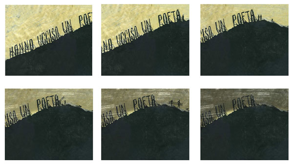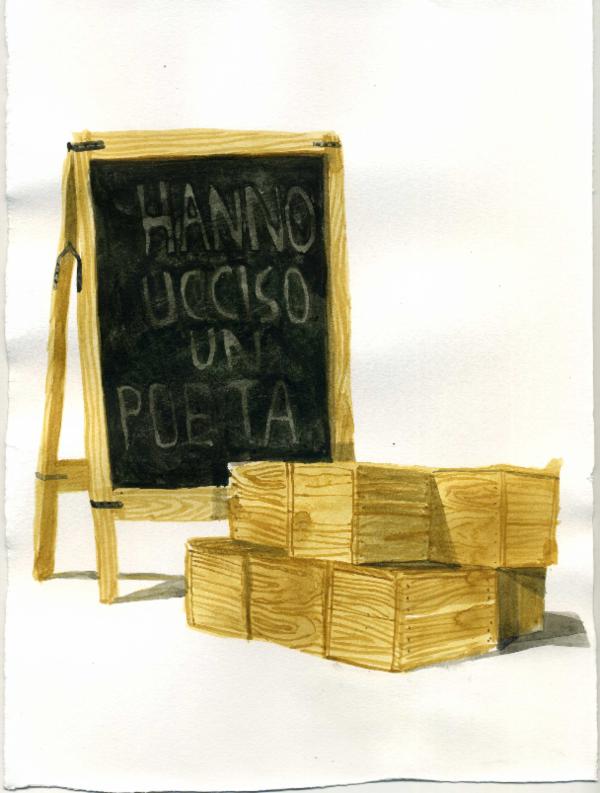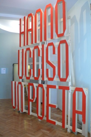 ucciso un poeta, convertida en un cartel de letras de madera de 3 X 3 metros, ocupa casi toda