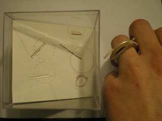 Técnica: anillo de plata y cuerda dibujo con incisiones, lápiz y grapas.